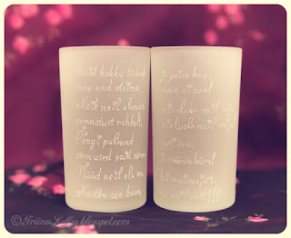 Mingi väike vimpka pidi asjal ikka sees ka olema ja nii ma lõin luuletuse lahku kahe klaasi peale, ühe klaasi peal oli luuletusest lause algused ja teisel lõpud, et kui klaasid kõrvuti asetada, siis saab ühe terviku ja saab lugeda tervet luuletust ühtselt :P